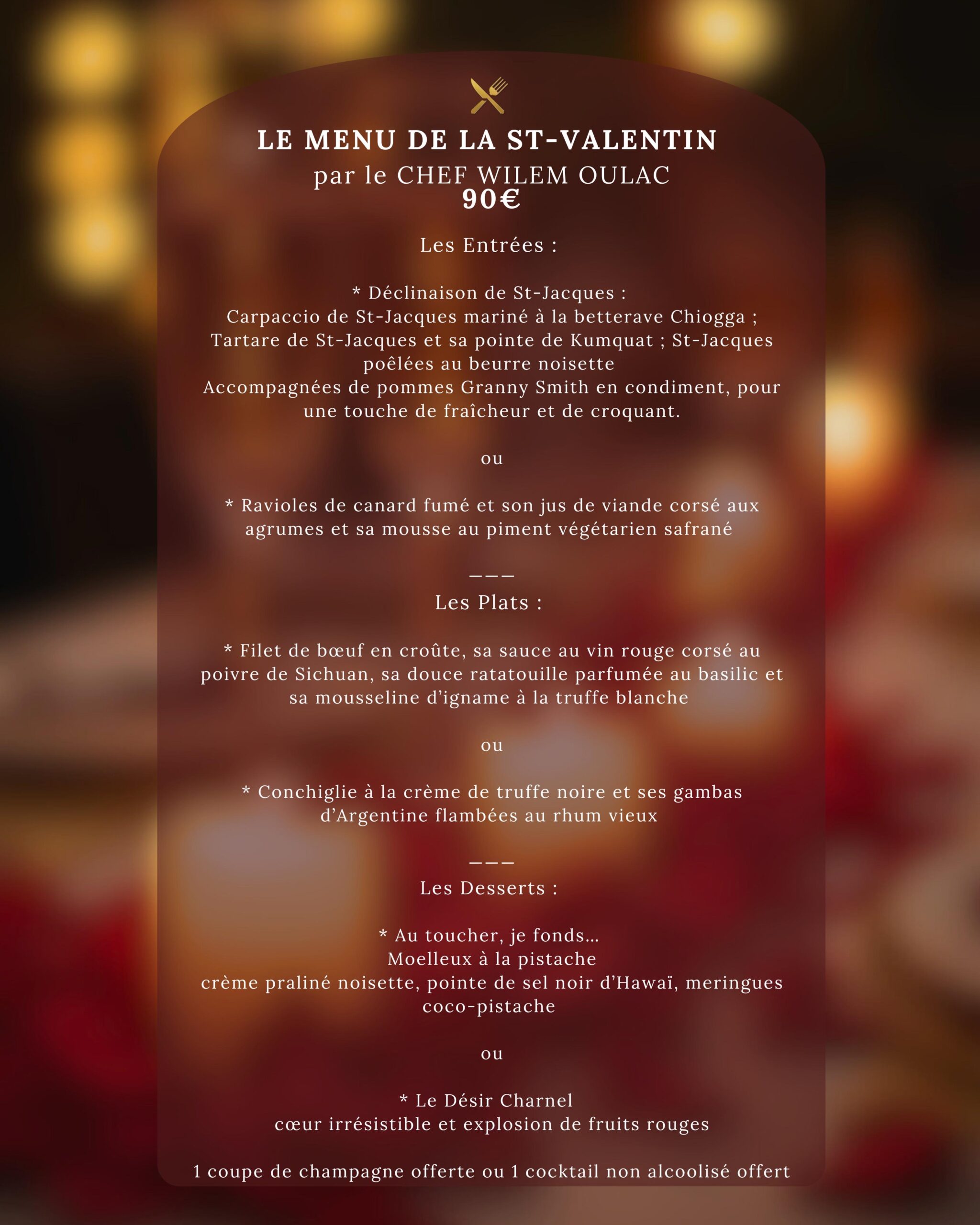 Dîner gastronomique d’exception signé Chef Wilem Oulac (entrée • plat • dessert) + ambiance musicale.